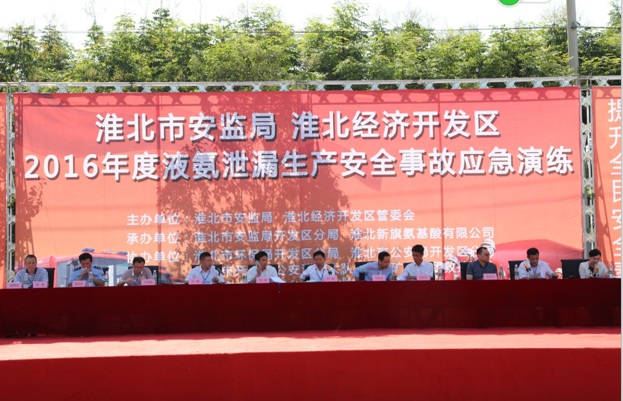 為提高園區(qū)安全生產(chǎn)事故的應(yīng)急救援能力,加強(qiáng)各部門的應(yīng)急處置協(xié)作能力,確??焖儆行?shí)施救援工作。2016年9月2日上午,市安監(jiān)局、開發(fā)區(qū)管委會(huì)、開發(fā)區(qū)安監(jiān)局、開發(fā)區(qū)環(huán)保局、開發(fā)區(qū)公安分局、開發(fā)區(qū)消防隊(duì)等部門,在淮北新旗氨基酸有限公司舉行液氨泄露應(yīng)急救援演練。